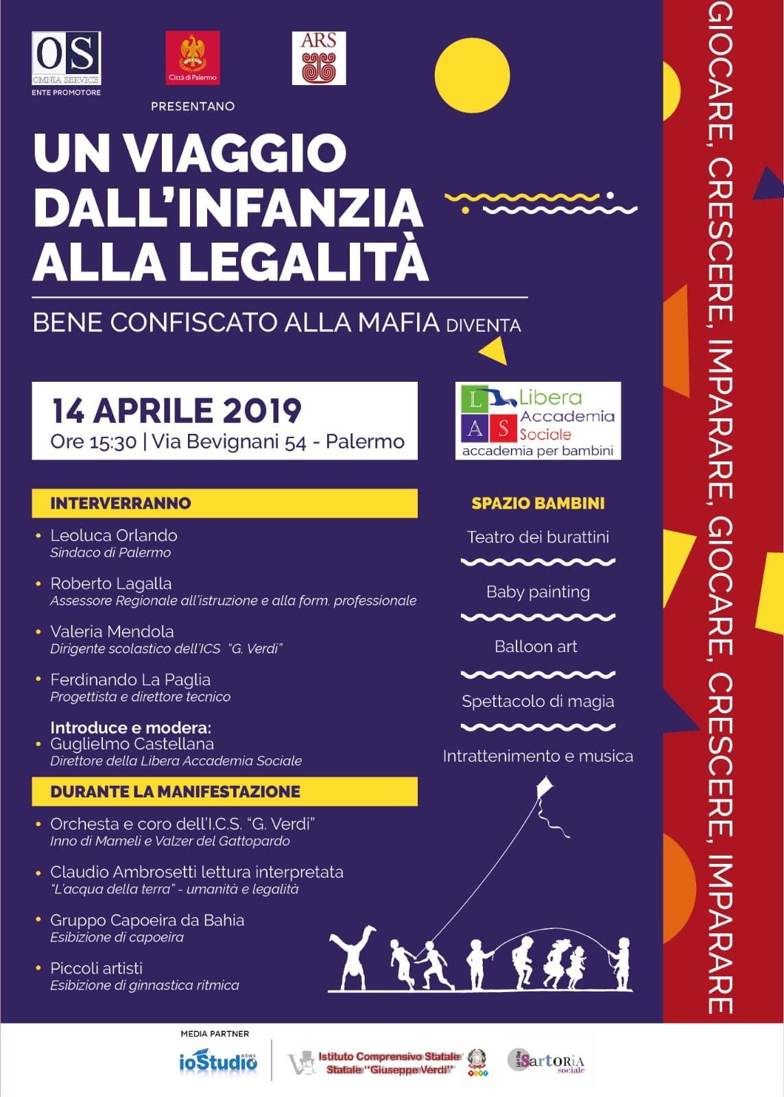 Questa in sintesi la mission di “Un viaggio dall’infanzia alla legalità – giocare, crescere, imparare”, leitmotiv dell’inaugurazione dei locali confiscati alla mafia e ora riassegnati a fini sociali che si svolgerà, domenica 14 Aprile 2019, dalle ore 15,30, a Palermo, in via Enrico Bevignani, a due passi dal Centro per la Giustizia Minorile del “Complesso Malaspina”.