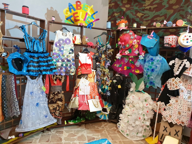Oltre ai cartelloni sono stati realizzati dei capi d’abbigliamento utilizzando materiale da riciclare, bottiglie vuote, vecchi cd ed altro.