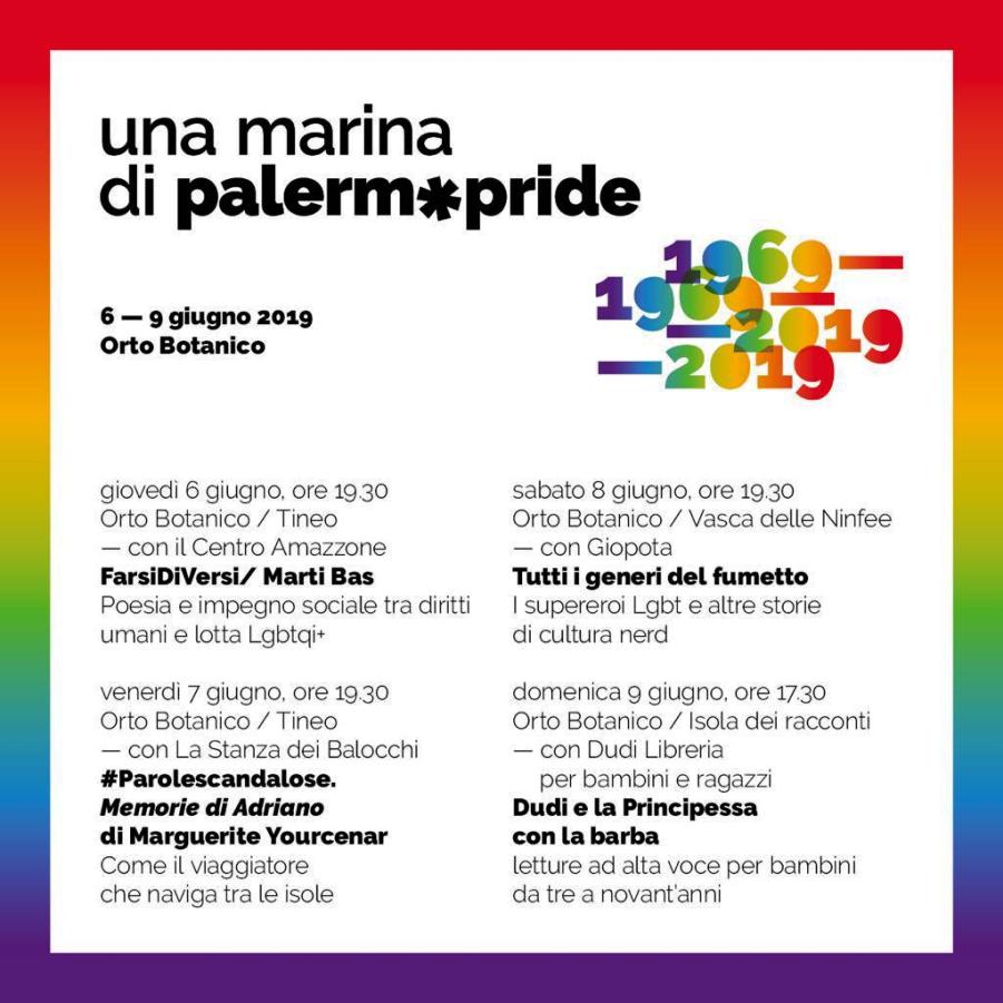 Dal 6 al 9 giugno il Palermo Pride è presente all’Orto Botanico di Palermo per la manifestazione “Una Marina di Libri” con quattro incontri, uno al giorno, organizzati in collaborazione con alcune delle più meritevoli realtà locali: Centro Amazzone, Libreria Dudi, Arcigay Palermo e l’associazione La stanza del balocchi. Sono quattro le finestre che si aprono sulla cultura Lgbt+ (e non solo) attraverso linguaggi, generi letterari e temi differenti.