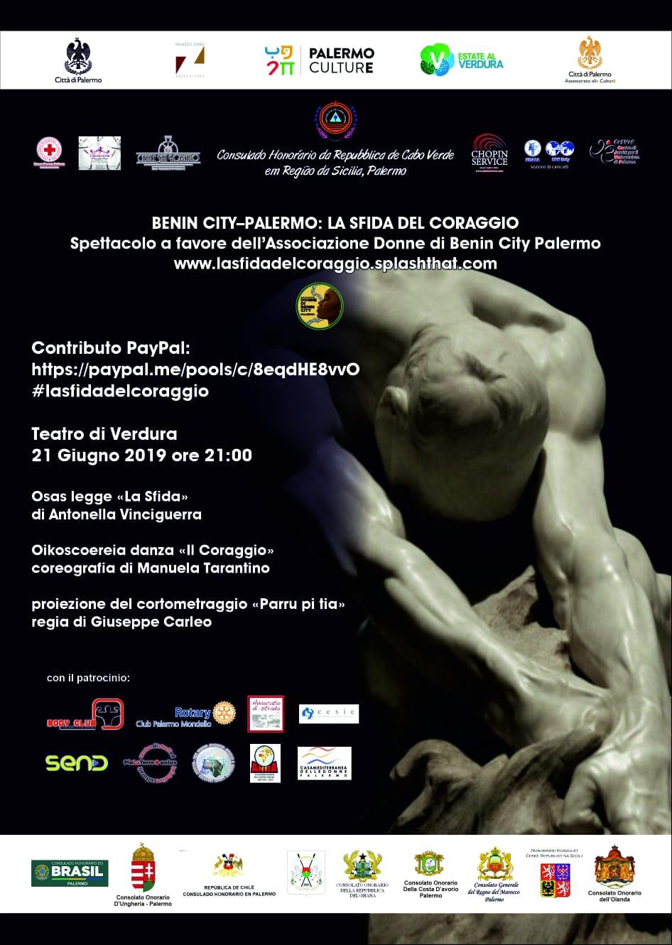 Venerdì 21 giugno alle ore 21 al Teatro di Verdura a Palermo verrà messo in scena “Benin City-Palermo: la sfida del coraggio”,spettacolo di beneficenza organizzato dal Consolato Onorario della Repubblica di Capo Verde a Palermo.