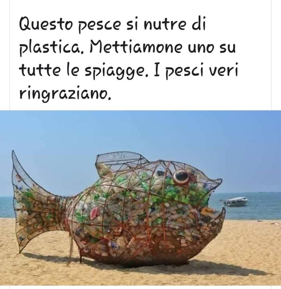 Sempre di più si cerca di coinvolgere quanto più possibile i cittadini, con iniziative come questa, ed anche con installazioni che colpiscono il passante, come la grande scultura a forma di pesce ma riempita dei rifiuti di plastica (foto sotto), a simboleggiare il fatto che i pesci facilmente ingeriscono rifiuti di plastica. E infatti un oggetto simile sarà realizzato successivamente all’iniziativa di sabato 29 giugno.