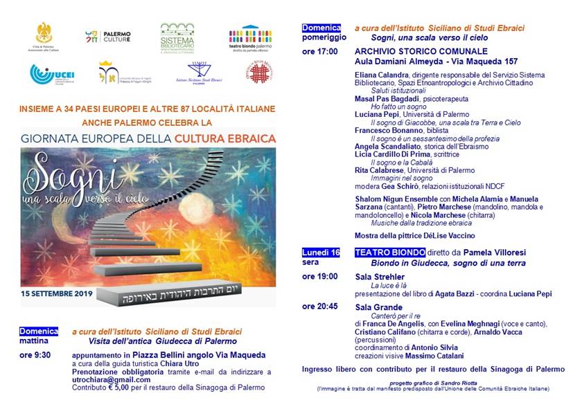 Anche quest’anno l’Istituto Siciliano di Studi Ebraici propone l’appuntamento con la Giornata Europea della Cultura Ebraica, giunto alla XX edizione. Domenica 15 settembre, di mattina, passeggiata nella Giudecca con la visita dell’Oratorio della Madonna del Sabato, futura Sinagoga. Di pomeriggio incontro all’Archivio Comunale con molti spunti intorno al tema di quest’anno, Sogni, una scala verso il cielo.