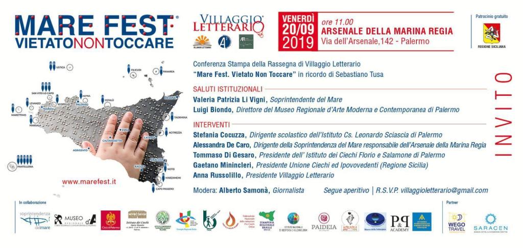 “Mare Fest. Vietato non toccare” è la Festa del Mare per bambini vedenti, ipovedenti e non vedenti, intitolata alla memoria di Sebastiano Tusa e in programma dal 23 al 28 settembre a Palermo, nell’ambito della quinta edizione del “Villaggio Letterario”: un modo per ricordare proprio l’impegno del professore Tusa per i non vedenti.