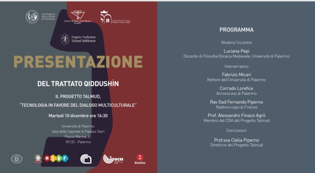 Martedì 10 dicembre alle 16.30 nella Sala delle Capriate a Palazzo Chiaramonte Steri piazza Marina sarà presentato uno dei progetti di traduzione mai intrapresi, il progetto della traduzione del Talmud babilonese in italiano, realizzato grazie ad un protocollo d’intesatra la Presidenza del Consiglio dei Ministri, MIUR, CNR, UCEI e CRI.