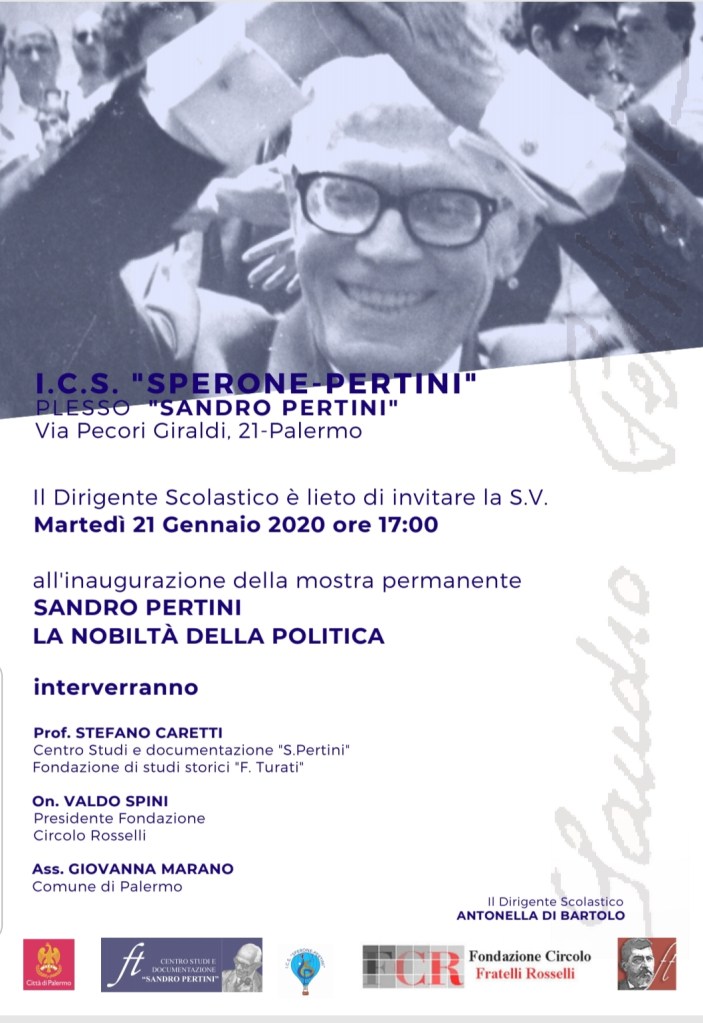 Sarà inaugurata martedì 21 gennaio alle ore 17.00 nella sede del plesso “Sandro Pertini” (via Pecori Giraldi 21) dell’Istituto Comprensivo Statale “Sperone – Pertini”, la mostra permanente, patrocinata dal Comune di Palermo, “SANDRO PERTINI – LA NOBILTA’ DELLA POLITICA”.
