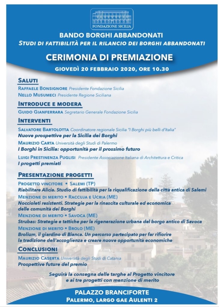 Cerimonia di premiazione “Bando borghi abbandonati. Studi di fattibilità per il rilancio dei borghi abbandonati” Dora Di Cara Patrimonio storico-monuntale 18 febbraio 202022 marzo 2020 1 Minute Condividi: Condividi su X (Si apre in una nuova finestra) X Condividi su Facebook (Si apre in una nuova finestra) Facebook Mi piace Caricamento... Correlati Pubblicato 18 febbraio 202022 marzo 2020