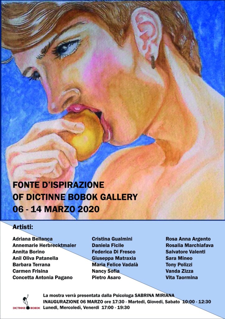 Ventuno artisti espongono le loro opere che rispondono alla domanda su cosa sia oggi fonte di ispirazione nell’arte. La mostra, che sarà presentata dalla psicologa Sabrina Miriana, sarà inaugurata venerdì 6 alle 17,30 presso la sede dell’associazione Dictinne Bobok in via NicolòGarzilli 28 e si potrà visitare lunedi, mercoledi e venerdi dalle 17.00 alle 19.30 e giovedi e sabato dalle 10.00 alle 12.30 fino al 14 marzo.