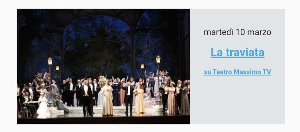 Continua l’attività del teatro Massimo. Il teatro ha sospeso da alcuni giorni tutte le attività aperte al pubblico in ossequio alle disposizioni governative per il contenimento dell’emergenza epidemiologica ed ha avviato una programmazione no stop di opere, concerti e spettacoli attraverso la propria web tv.