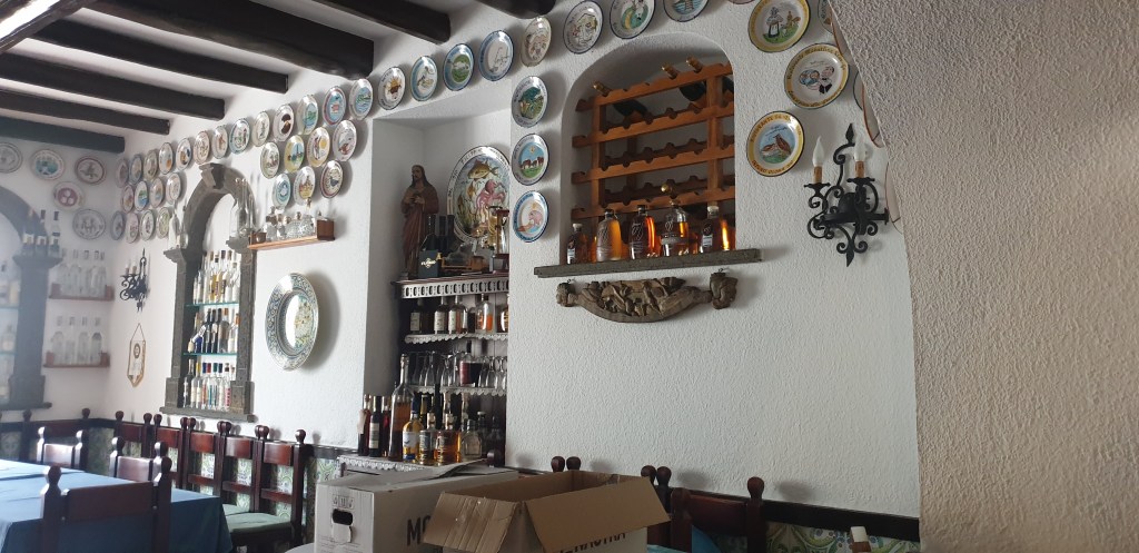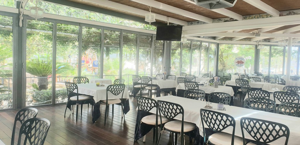 Le due sale interne sono arredate in legno massello scuro e colori tenui con mobili d’epoca e un caldo camino. E alle pareti la collezione di piatti in ceramica di Vietri con le specialità tipiche dei vari locali dipinte a mano.