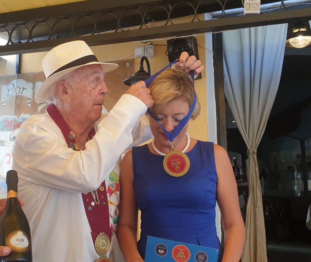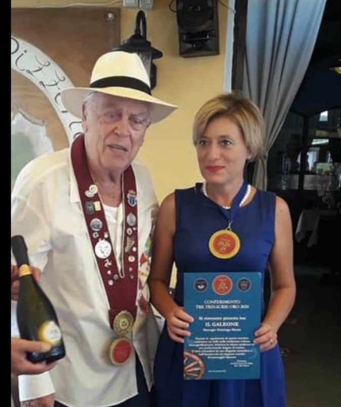 Il Club Corone Oro Sicilia assegna tre Trinacrie (nella foto sopra il presidente del Club Aldo Palmeri insignisce della Corona la proprietaria del locale Dominga Monte). E’ un momento magico. L’emozione per il conferimento è tanta. Staff del locale e membri del Club festeggiano insieme con un brindisi.