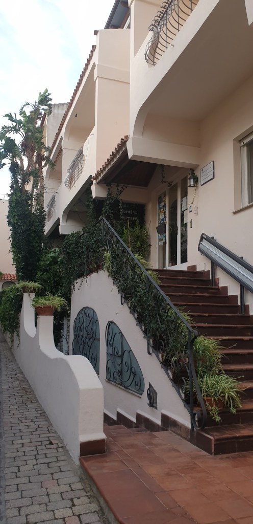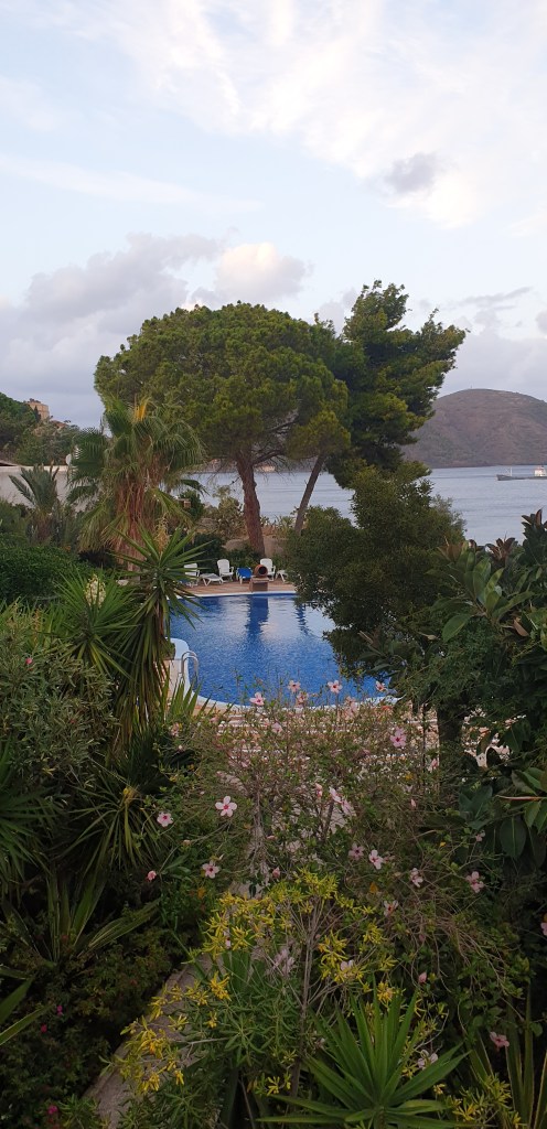 Vista stupenda, una meravigliosa piscina con acqua salata immersa in un giardino lussureggiante, l’atmosfera carica di entusiasmo che vive ancora nel migliore stile architettonico dell’edilizia alberghiera degli anni Settanta del secolo scorso. Arcate volumi e movimenti, intonaci a spugna, tegole a coppo e mattoni rossi, ferri battuti tondeggianti, e intorno tante, tante essenze arboree.