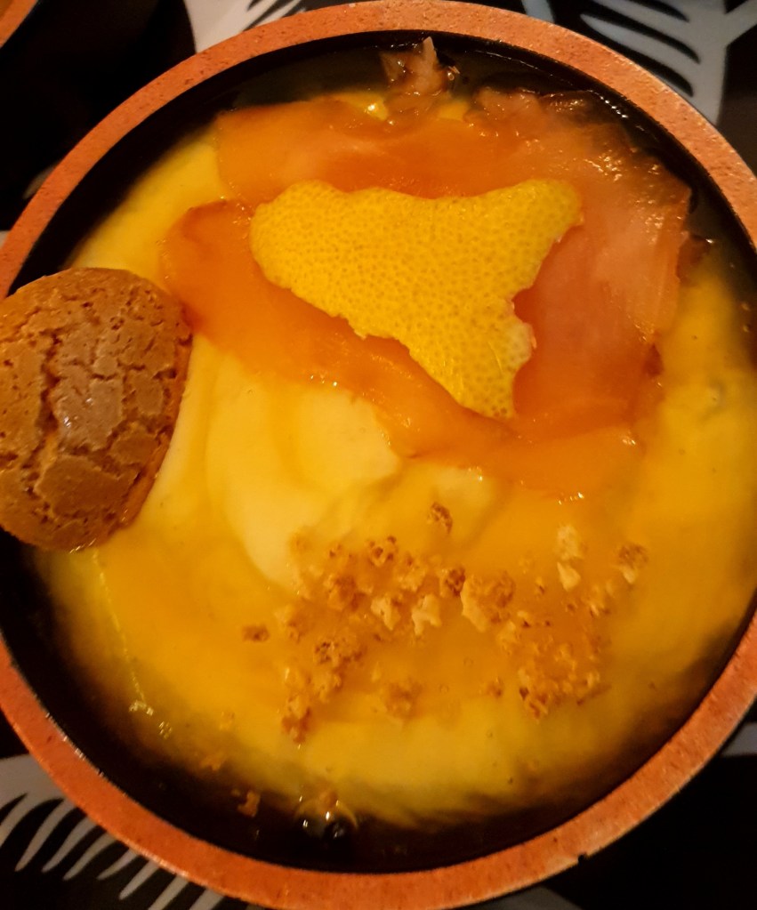 Buoni vini e dessert completano l’esperienza. Nella foto sotto un dolce caramellato con il disegno a forma di Sicilia in omaggio al Club Corone Oro Sicilia che ha deciso di attribuire un riconoscimento al locale, conferendogli sue Corone Oro.