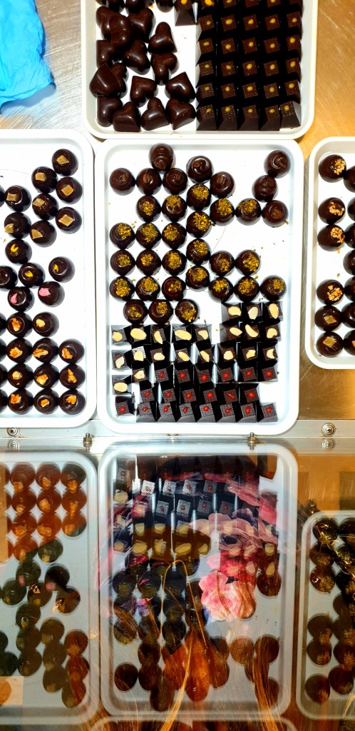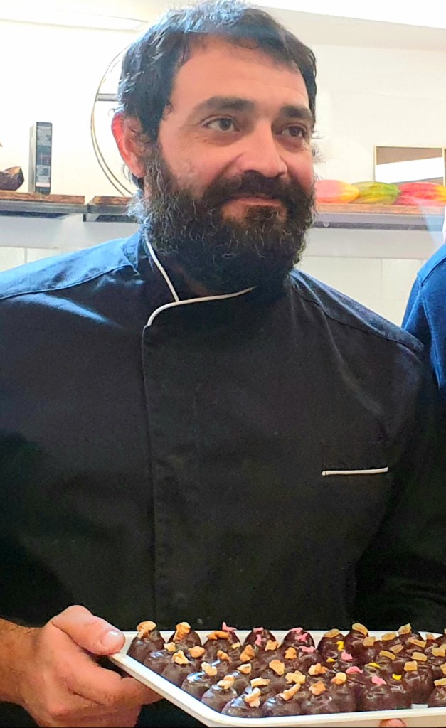 Scelta delle fave di cacao, analisi del sapore e del profumo in base alla zona di provenienza. Costa Rica, Ecuador, Venezuela Nicaragua, Repubblica Dominicana, Guatemala. Estrazione del burro di cacao, nome bello da sentire e anche da vedere e al naturale con le sfumature organolettiche e olfattive del paese di provenienza. Ci soffermiamo rapiti ad ascoltare. Le praline di fondente al passion fruit, al caffè, al limone, e in tante altre varietà sono deliziose. Varietà e produzione che si incrementato con il periodo invernale.