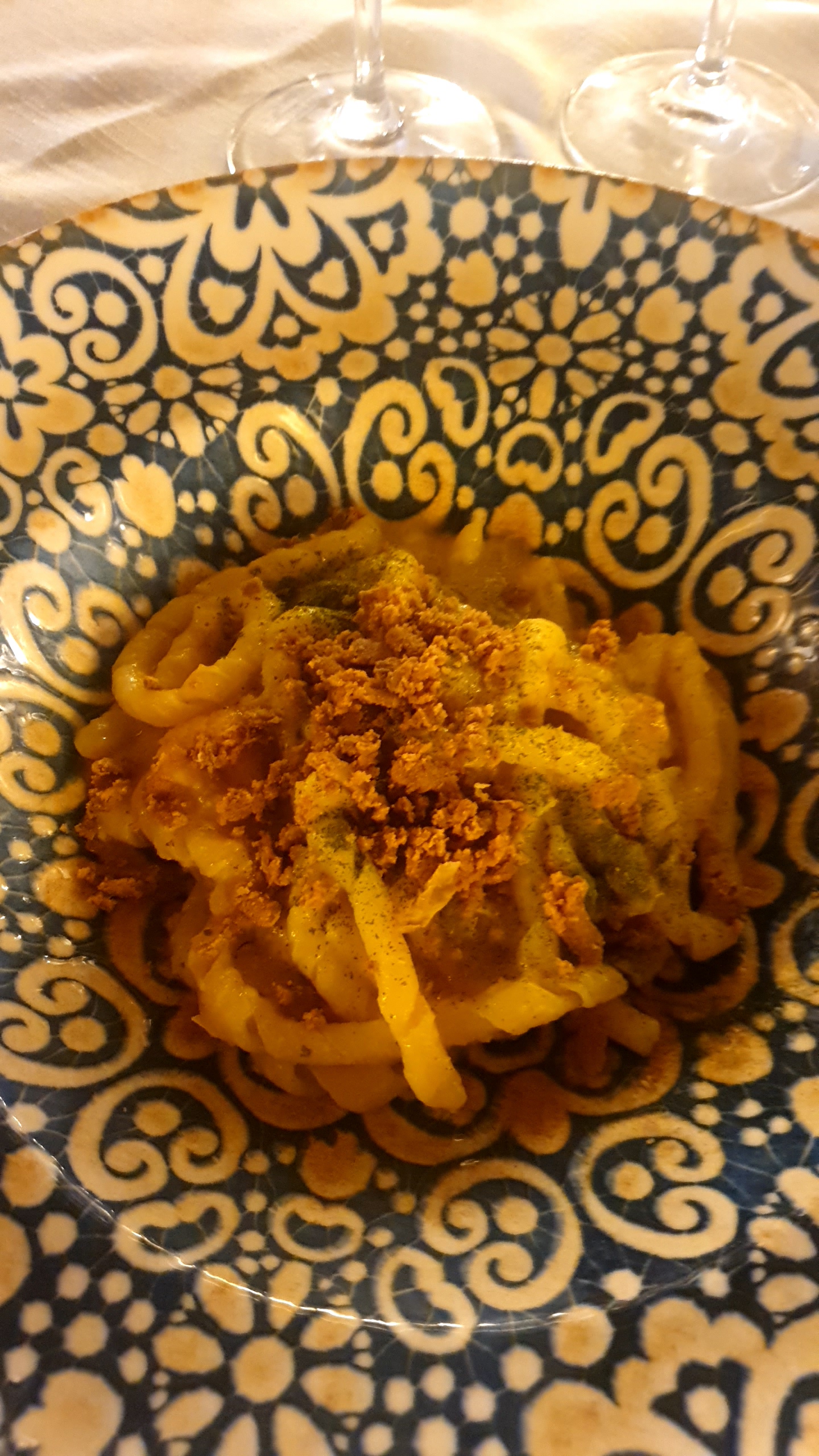 E finalmente dalla cucina arrivano i caratteristici piatti di ceramica dal decoro magrebino con le prelibatezze della casa. Il patron Andrea Tagliava, conoscitore della cultura contadina e quindi delle materie prime e del loro uso parco e sapiente, sa cosa proporre, coadiuvato in questo dal bravo Gino Tagliavia, talentuoso autodidatta.