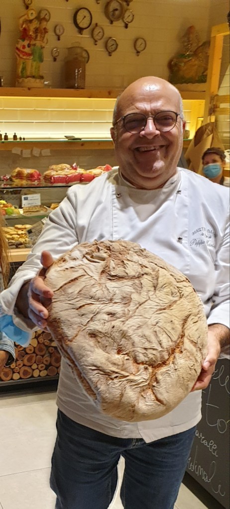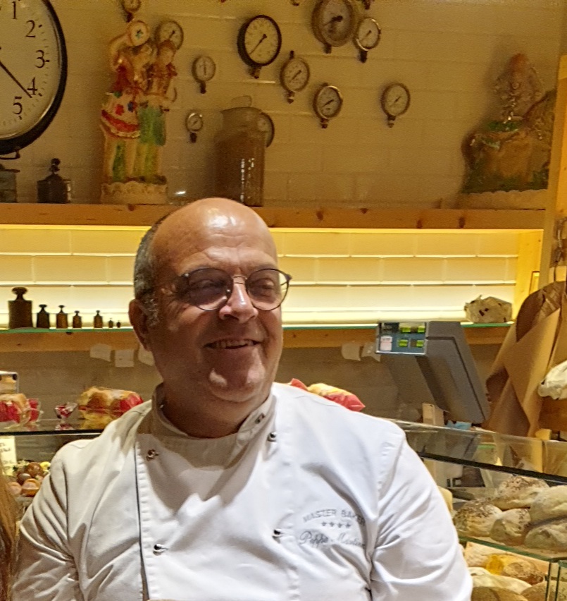 Abbiamo intervistato Giuseppe Martinez, artigiano panificatore, grande professionista e grande appassionato. Maestro di panificazione ed esperto dei problemi della lievitazione, gestisce il panificio fondato da suo padre a Trapani, la sua città, negli anni 50 del secolo scorso. Docente di panificazione, invitato a tenere corsi anche in santuari come il Petra Molino Quaglia di Padova, insignito di numerosi riconoscimenti, dal Gambero Rosso alle Corone Oro Sicilia, all’Unesco, a primi premi nazionali ed internazionali, Martinez tra le altre cose ha esposto all’Expo Milano 2015 ed è stato fornitore ufficiale al G7 di Taormina 2017. Nella foto sopra Martinez con una pagnotta, o vastedda, da tre chili.