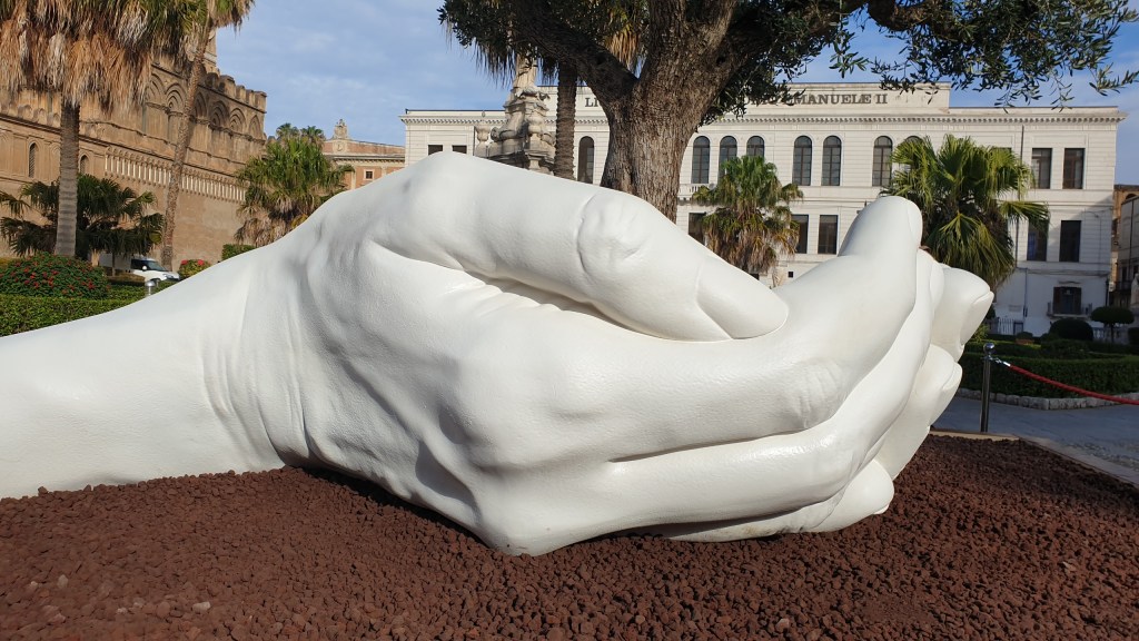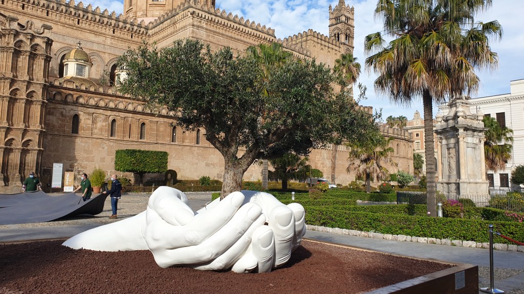 E’ stata inaugurata e presentata oggi alla stampa sul sagrato della Cattedrale, “Give” l’opera di Lorenzo Quinn, artista contemporaneo famoso nel mondo per le sue “mani” ed emblema della scultura figurativa. Presenti, tra gli altri, l’Arcivescovo Corrado Lorefice, il sindaco Leoluca Orlando, il vice sindaco, Fabio Giambrone insieme agli altri assessori Mario Zito e Sergio Marino, Monsignor Filippo Sarullo e Padre Giuseppe Bucaro.