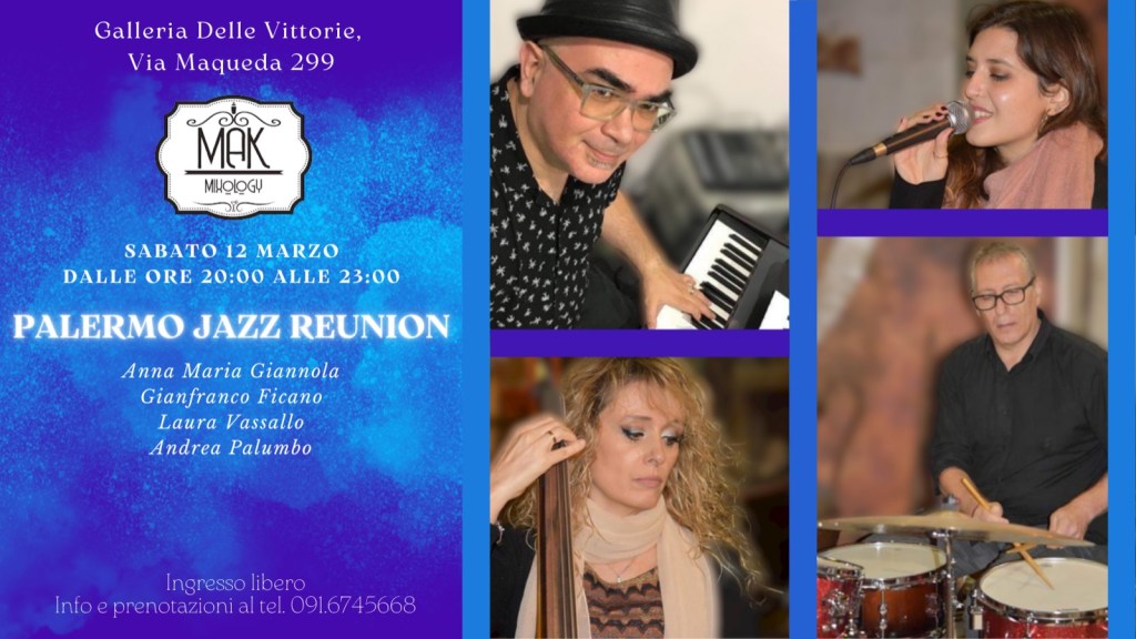 Alla Galleria delle Vittorie, sabato 12 marzo il “Palermo Jazz Reunion”. Dal jazz alla bossa nova attraverso improvvisazioni e interplay con i grandi classici del jazz, spaziando dallo swing più divertente alla bossa nova più sensuale sino ai brani della tradizione pop italiani rivisitati dal “PALERMO JAZZ REUNION”, gruppo che nasce da un’idea di Gianfranco Ficano e di Anna Maria Giannola, rispettivamente alla batteria e al contrabbasso. Insieme a loro, la voce di Laura Vassallo e il piano di Andrea Palumbo.