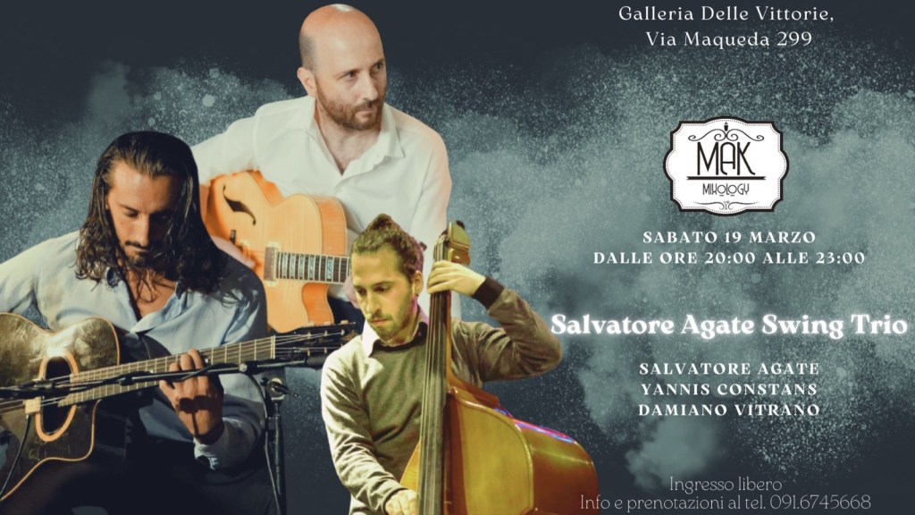 La musica del trio “Salvatore Agate Swing” in programma dalle 20 alle 23 di sabato 19 marzo, alla Galleria delle Vittorie.