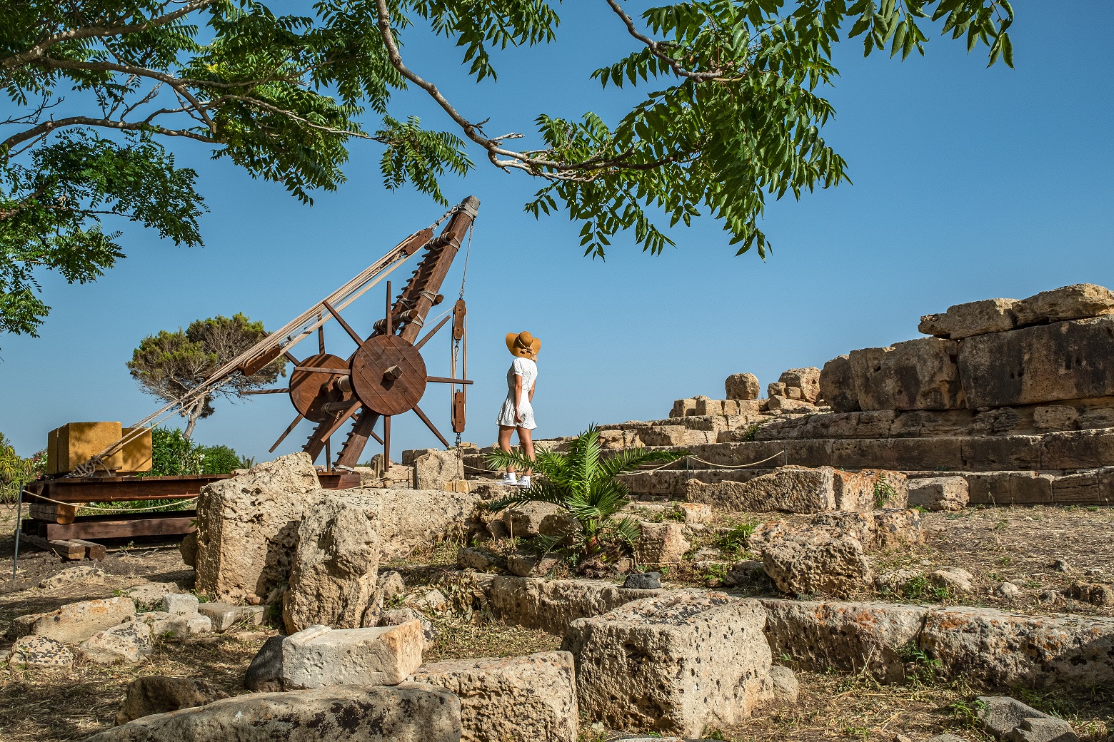 Il percorso della mostra parte da Cave di Cusa da dove vennero estratti i materiali per la costruzione dei templi selinuntini: le cave sono un vero manuale dei sistemi di scavo, la brusca interruzione dei lavori di estrazione – al sopraggiungere dell’esercito cartaginese – ha fatto sì che venissero abbandonati persino i rocchi finiti, pronti per essere trasportati. Accanto agli enormi blocchi del Tempio G, è stata posizionata la riproduzione della “slitta” che serviva al trasporto, scivolava su rulli di legno e veniva trasportata dai buoi; vicino, ecco la Macchina di Chersifrone (usata per il trasporto dei rocchi più imponenti tramite rotolamento, intelaiato con travi di legno connesse all’asse di rotazione del tamburo) e della Macchina di Metagene (dal nome del figlio di Chersifrone) utilizzata invece per il trasporto degli architravi: una ruota lignea dentro la quale inserire i blocchi che potevano così rotolare trainati da animali da soma dalla cava fino alla fabbrica.