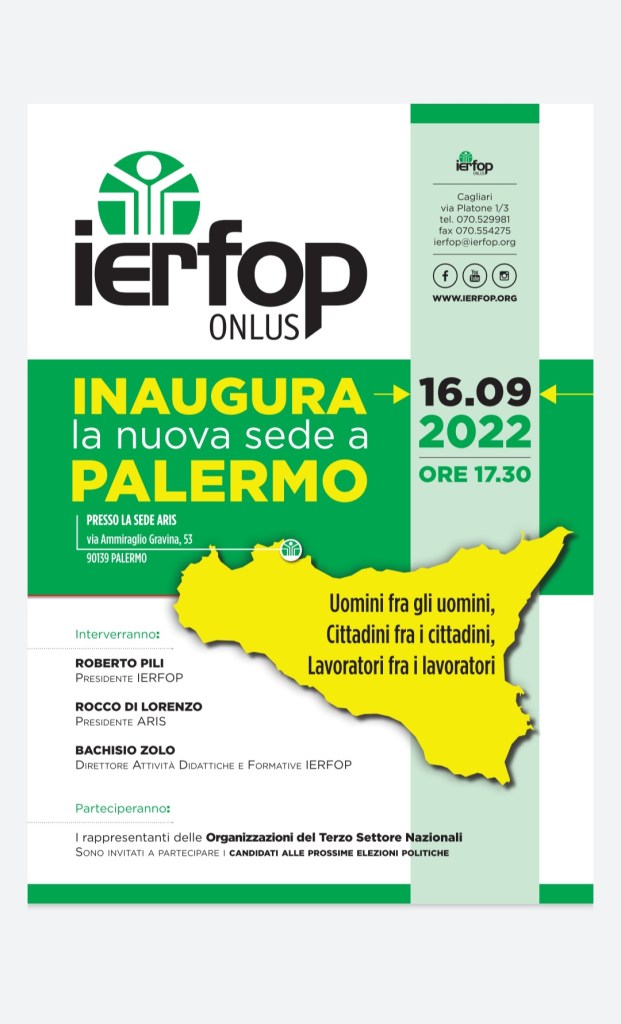 Venerdì16 settembre alle ore 16,30 in via Ammiraglio Gravina 53, sarà inaugurata la nuova sede dello Ierfop Onlus.lo Ierfop, Istituto europeo per la ricerca e l’orientamento professionale apre la sua sede di Palermo ospitata dalla Aris, l’associazione che si occupa di sostegno e formazione delle persone con disabilità visiva.Saranno presenti Roberto Pili e Bachisio Zolo, rispettivamente presidente e direttore didattico Ierfop e Rocco Di Lorenzo.