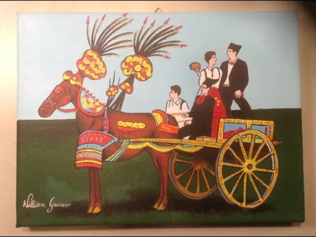 Nella foto sotto un carretto siciliano in un dipinto di William Giocoso.