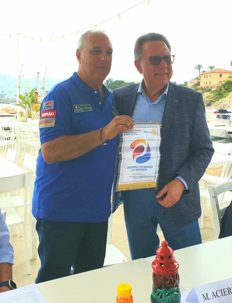 Salperà in autunno da Genova l’Aretusa Explorer, il gommone RIB Prince 38 condotto da Sergio Davì alla scoperta dei Fari d’Italia. L’iniziativa, che ha il patrocinio, tra gli altri del Comune di Palermo, della Regione Siciliana e del Rotary Club Distretto 2110, è stata presentata nella sede del White Club all’Arenella. Nella foto sopra Sergio Davì, a sinistra, e il governatore del Rotary Goffredo Vaccaro.
