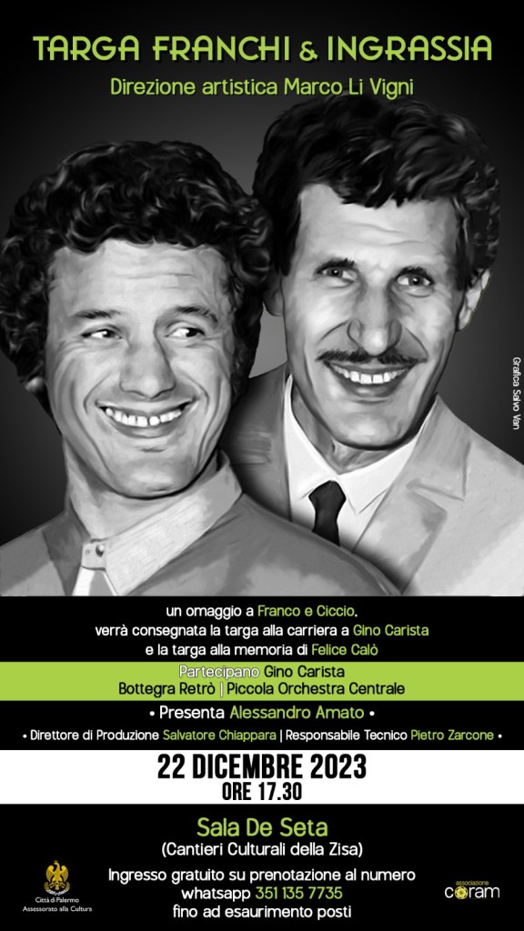 Venerdì 22 dicembre mbre alle 17.30 nella sala De Seta ai Cantieri Culturali alla Zisa, si svolgerà un evento dedicato al famoso duo comico. Gino Carista, Bottega Retrò e la Piccola Orchestra centrale presentati da Alessandro Amato si esibiranno con show, musica e cabaret. Nel corso dello spettacolo saranno consegnate le targhe ad essi intitolate ad artisti comici palermitani. Una targa alla carriera a Gino Carista ed una alla memoria a Felice Calò. La direzione artistica è di Marco Li Vigni, direttore di produzione Salvatore Chiappara, responsabile tecnico Pietro Zarcone. L’evento è ad ingresso libero ed è organizzato dall’associazione Coram con il patrocinio dell’assessorato alla cultura del comune di Palermo.