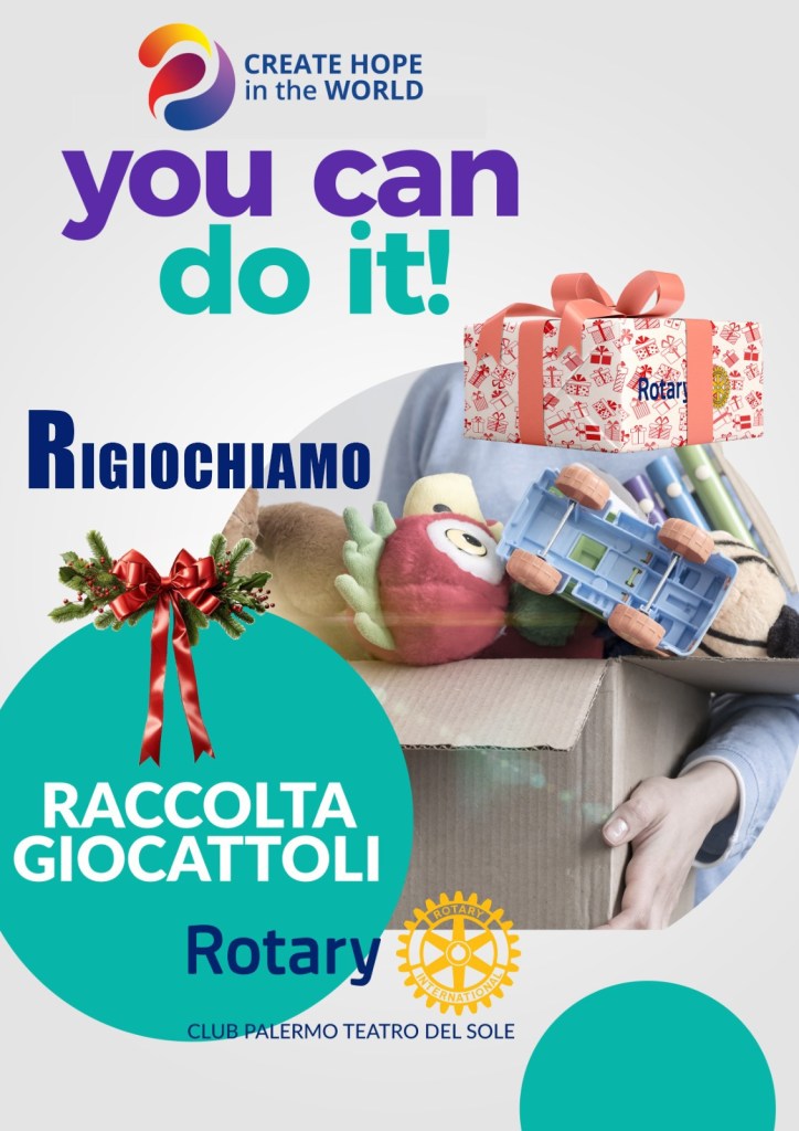 Quanti giocattoli ci sono in casa usati poco ma che potrebbero fare la gioia di un bambino? Grazie a “Rigiochiamo” questi giocattoli vengono raccolti e distribuiti nelle parrocchie dove genitori in difficoltà economiche possono riceverli e farne così il dono di Natale ai loro bambini. Si tratta di un’iniziativa del Rotary club Palermo Teatro del Sole giunta così alla quarta edizione. L’iniziativa, che con le numerose adesioni si conferma tra le più importanti del Club, ideata da Paolo Lo Iacono, socio e past president del Club, consiste in una sorta di banco del regalo ottenuto raccogliendo i giocattoli non più usati da mettere a disposizione dei genitori in difficoltà e dare loro il modo di non privare i propri figli della gioia del ricevere i regali di Natale. Più di 200 giocattoli sono stati raccolti in pochi giorni grazie anche alla raccolta effettuata con il prezioso contributo della scuola Alberico Gentili.