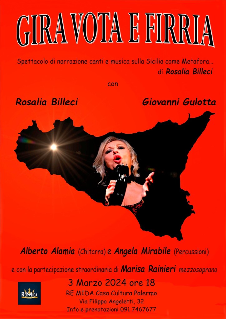 Spettacolo di Rosalia Billeci domenica 3 marzo al Re Mida. Nel teatro di via Filippo Angeletti 34, alle 18, avrà luogo la rappresentazione di “Gira vota e firria”, l’ultimo lavoro di Rosalia Billeci. La Billeci, che alla professione medica affianca la passione per il teatro, propone un recital che ha per tema la Sicilia e i Siciliani e si propone di raccontare con ironia e leggerezza, com’è nel suo stile, la Sicilia dalle innumerevoli storie.