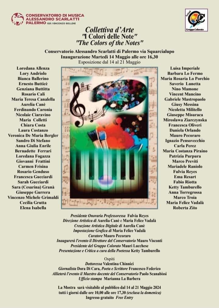 È stata inaugurata ieri 14 maggio alle 16 al Conservatorio Alessandro Scarlatti la collettiva “I colori delle note”. Una rassegna di lavori di qualità, dalle tecniche e dagli stili diversi dove gli artisti hanno trovato grandi capacità espressive. La visita ai lavori esposti diventa così un’esperienza di successione di sensazioni e scoperte che si susseguono regalando sorprese inaspettate. Il tema, la musica, è certamente di quelli in grado di scatenare fantasia ed emozioni. E così ecco che ciascun artista ha messo su tela un tema musicale, titolo, opera, romanzo, arie, ma anche musicisti stessi, da Mozart e Beethoven a Edith Piaf. Il visitatore passa così da uno stile all’altro in un tour emozionante davvero appassionante.