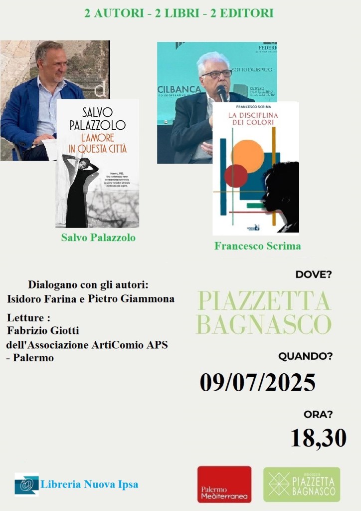 “L’amore in questa città” di Salvo Palazzolo e “La disciplina dei colori” di Francesco Scrima i libri che saranno presentati mercoledì 9 Luglio in piazzetta Bagnasco. La presentazione avrà inizio alle 18.30 e sarà curata dalla Libreria “Nuova Ipsa”.