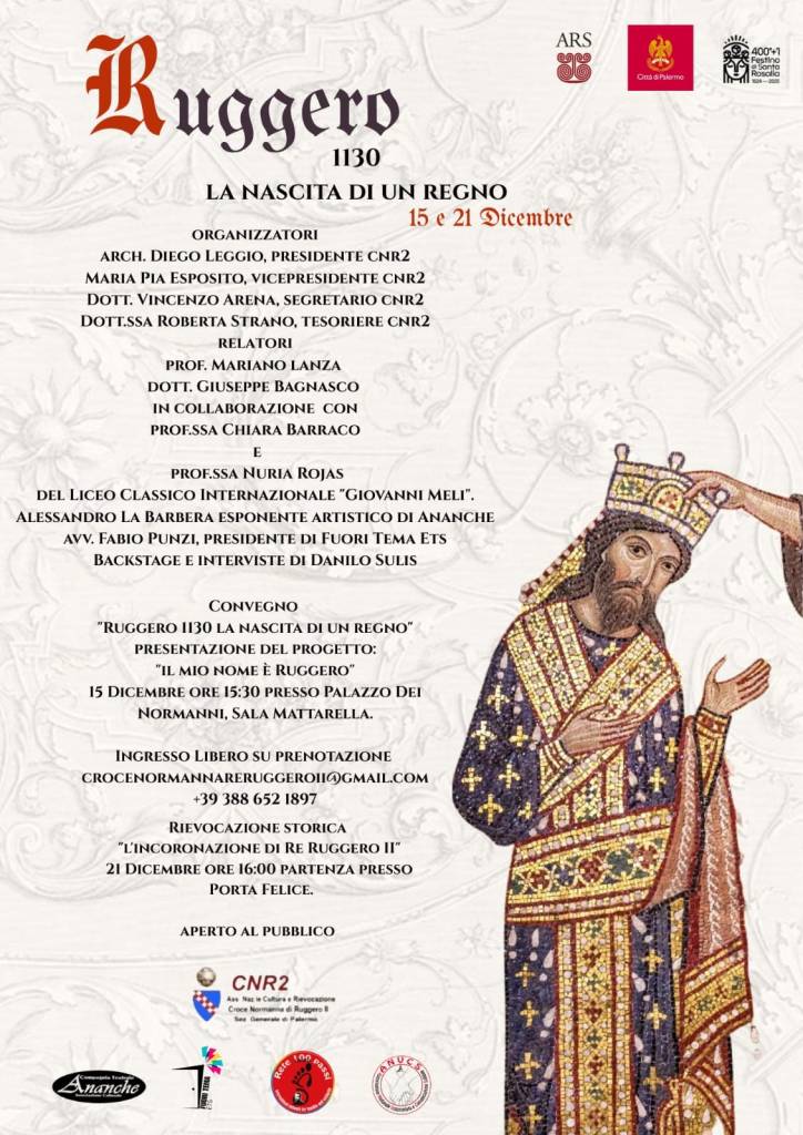 L’Associazione Nazionale Cultura e Rievocazione “Croce Normanna di Ruggero II”, con il patrocinio dell’ARS – Assemblea Regionale Siciliana, del Comune di Palermo (400°+1 anniversario di Santa Rosalia) e della Fondazione Federico II, presenta due appuntamenti dedicati alla celebrazione dell’eredità normanna e della nascita del Regno di Sicilia.