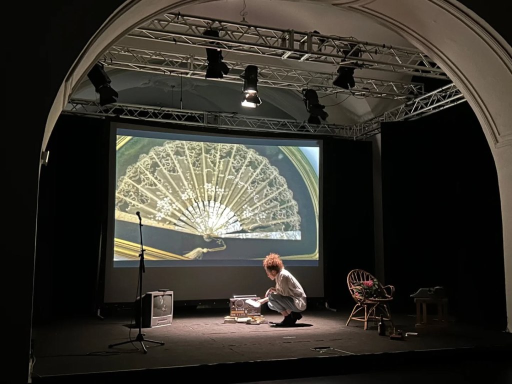 Da una macchina da scrivere, una radio mangianastri, una vecchia TV si diffondono interferenze di voci e immagini che entrano in dialogo con l’interprete.