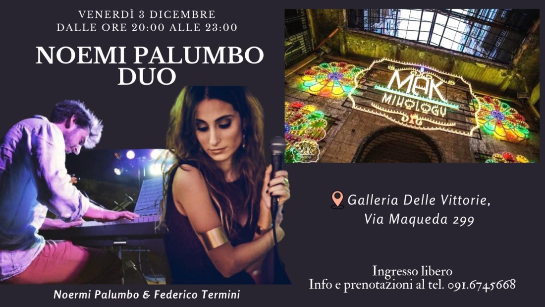 Dai classici di Duke Ellington e Cole Porter alle sonorità moderne soul e R&B di artisti come Eryka Badu e Robert Glasper. Una serata musicale intensa dalle 20 alle 23 di venerdì 3 dicembre alla Galleria delle Vittorie, con il NOEMI PALUMBO DUO. La formazione composta da Noemi Palumbo, voce/ loopstation e Federico Termini al pianoforte, … Continua a leggere Soul e jazz, venerdì 3 dicembre alla Galleria delle Vittorie, con il “Noemi Palumbo duo”