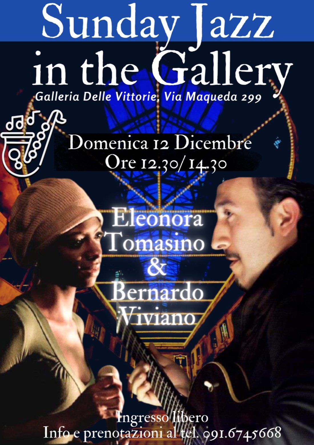 Eleonora Tomasino e Bernardo Viviano sono i prossimi ospiti dell’appuntamento di domenica12 dicembre con “Sunday Jazz in the Gallery”, la rassegna che ogni domenica offre la possibilità di trascorrere alla Galleria delle Vittorie l’aperitivo delle 12.30 accompagnati dalle più famose sonorità jazz offerte dagli artisti dell’attuale panorama jazzistico siciliano. Uniche le sfumature che regalerà la … Continua a leggere Galleria delle Vittorie, alle 12.30 domenica 12 dicembre, “Sunday Jazz in the Gallery” con Eleonora Tomasino e Bernardo Viviano