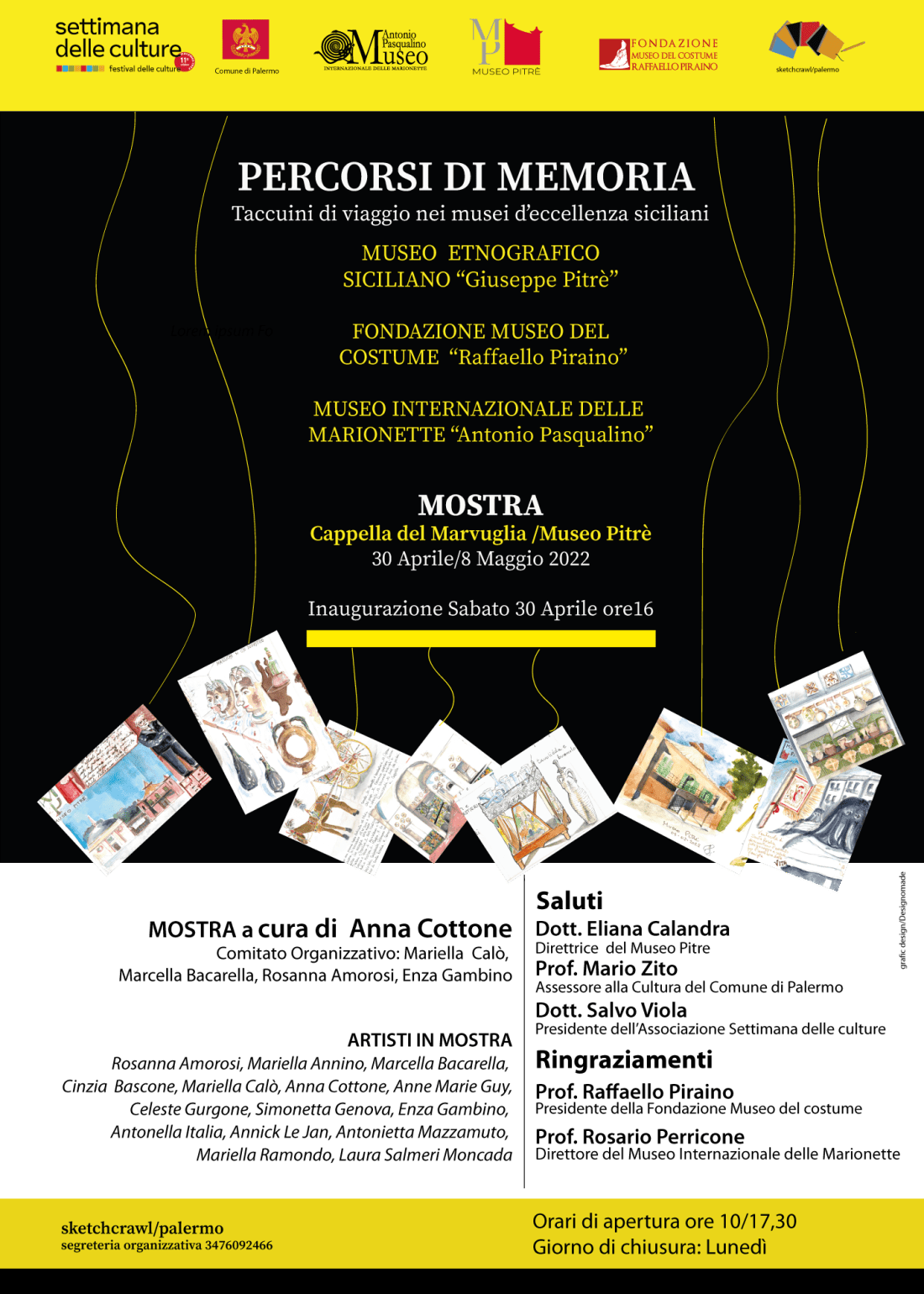 Sabato 30 aprile alle ore 16.00 nella Cappella del Marvuglia presso il Museo Pitrè si inaugura la mostra “Taccuini di viaggio”. In mostra, le opere degli artisti del gruppo Sketchcrawl/Palermo, che dal 2013, utilizzano piccoli taccuini in cui annotare impressioni e storie. Quest’anno il viaggio si è svolto in tre musei, il Museo etnografico siciliano … Continua a leggere Mostra collettiva dal titolo “Taccuini di viaggio”